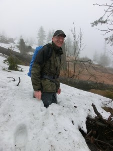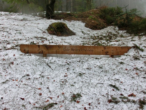 Kurz nach 8 starteten wir unsere Wanderung am Parkplatz in Oberschwarzenberg, noch ohne Regen. Kurz vor dem Parkplatz hatten wir Schneereste gesichtet, machten uns aber keine größeren Gedanken. Unser Plan war, über den Witikosteig aufzusteigen und dann über das Steinerne Meer zurückzuwandern. Schon nach wenigen Metern zeigte sich, dass der Weg zum Teil tief verschneit war und man regelmäßig einsank. Außerdem war gleich zu Beginn die Querung eines Baches nicht an der dafür vorgesehenen Stelle möglich, weil er zu viel Wasser führte. Etwas oberhalb fanden wir dann eine passende Stelle und „reisten“ nach Deutschland ein. In den darauffolgenden zwei Stunden kämpften wir uns durch den Schnee, in den wir regelmäßig einbrachen. Es war extrem mühsam, und wir kamen nur langsam vorwärts. Außerdem zehrten das ewige Einsinken/Einbrechen und das anschließende mühsame Rausklettern an meinen (unseren?) Kräften. Kurz unterhalb des Dreisesselberg-Gipfels schwenkten wir auf den Goldsteig ein, ohne den eigentlichen Gipfel erreicht zu haben. Zwischenzeitlich hatte es auch zu regnen begonnen. 😦