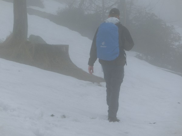 Es begann eine lange Hangquerung, in der wir teilweise echt Mühe hatten, die Markierung zu finden. Außerdem gab es hier viele Stellen, an denen umgestürzte Bäume, Steine und dichtes Geäst unter dem Schnee versteckt lagen. Es kam des Öfteren vor, dass wir durch den Schnee durchbrachen und hüfthoch „versanken“…Gott sei Dank verliefen diese Stürze glimpflich.
