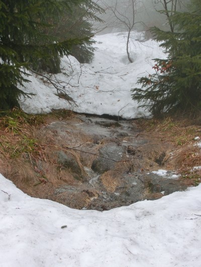 In einer Regenpause gönnten wir uns eine kurze Stärkung, ehe wir zum „Steinernen Meer“ kamen. Dabei handelt es sich um eine Granitblockhalde, von der man laut Wanderbuch „einen prachtvoll weiten Ausblick auf Bayern und das Mühlviertel“ hat. Das einzige, was WIR sahen, war eine Wolken- und Nebelsuppe. 😦 Nach der Durchquerung des Steinernen Meeres wurde der Weg zwischenzeitlich etwas besser. Die Schneedecke war teilweise verschwunden. Eine Herausforderung war dann erneut der „Grenzbach“. Nur ganz vorsichtig wagten wir über eine Schneebrücke die Querung. Zwar wusste ich, dass hier eigentlich ein Steg sein muss, aber er war unter dem Schnee nicht wirklich zu erkennen.